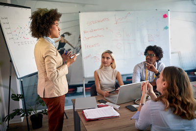 - Round-the-table updates: each member shares a business success, an update on her commitment from last meeting, and gets an opportunity to problem solve with teammates.